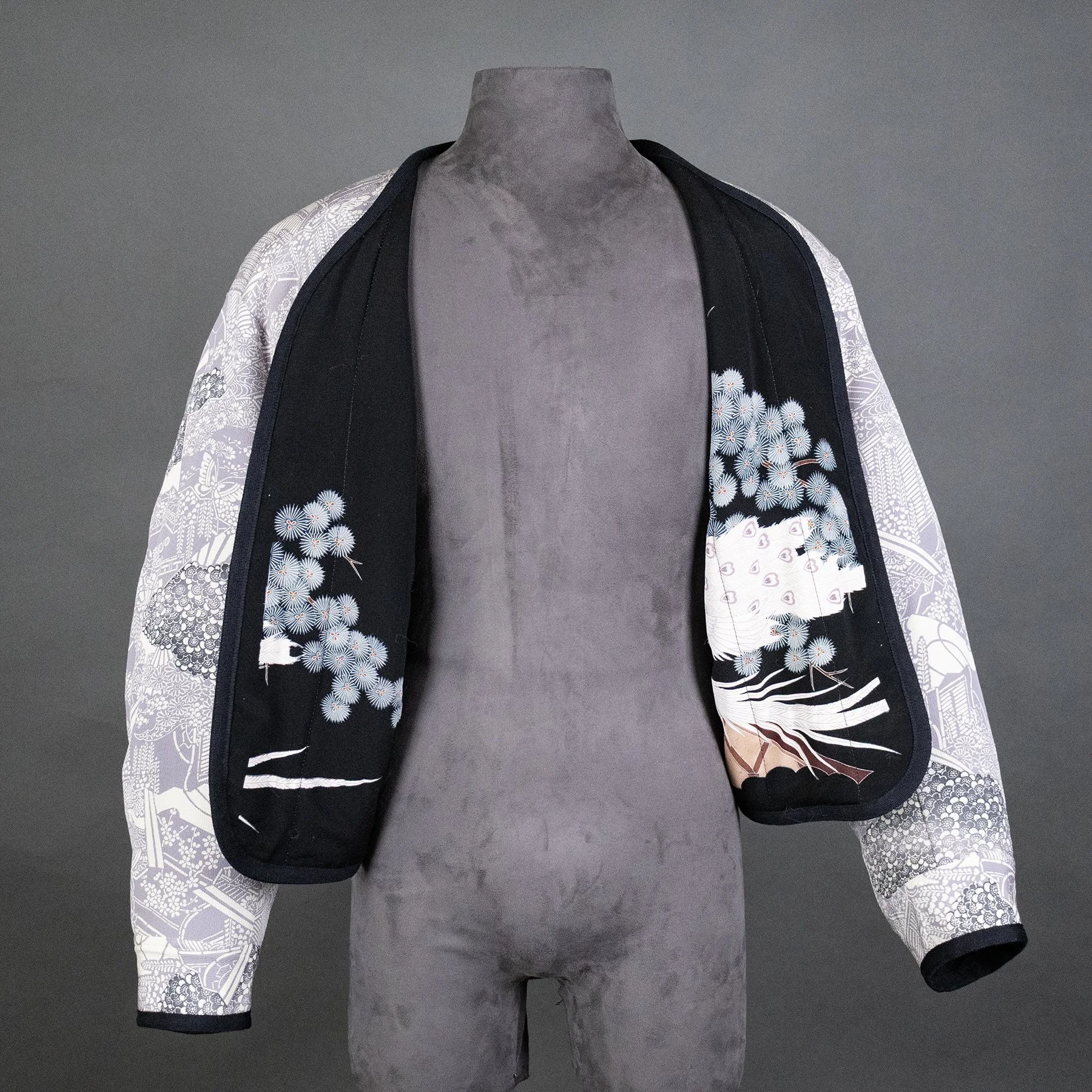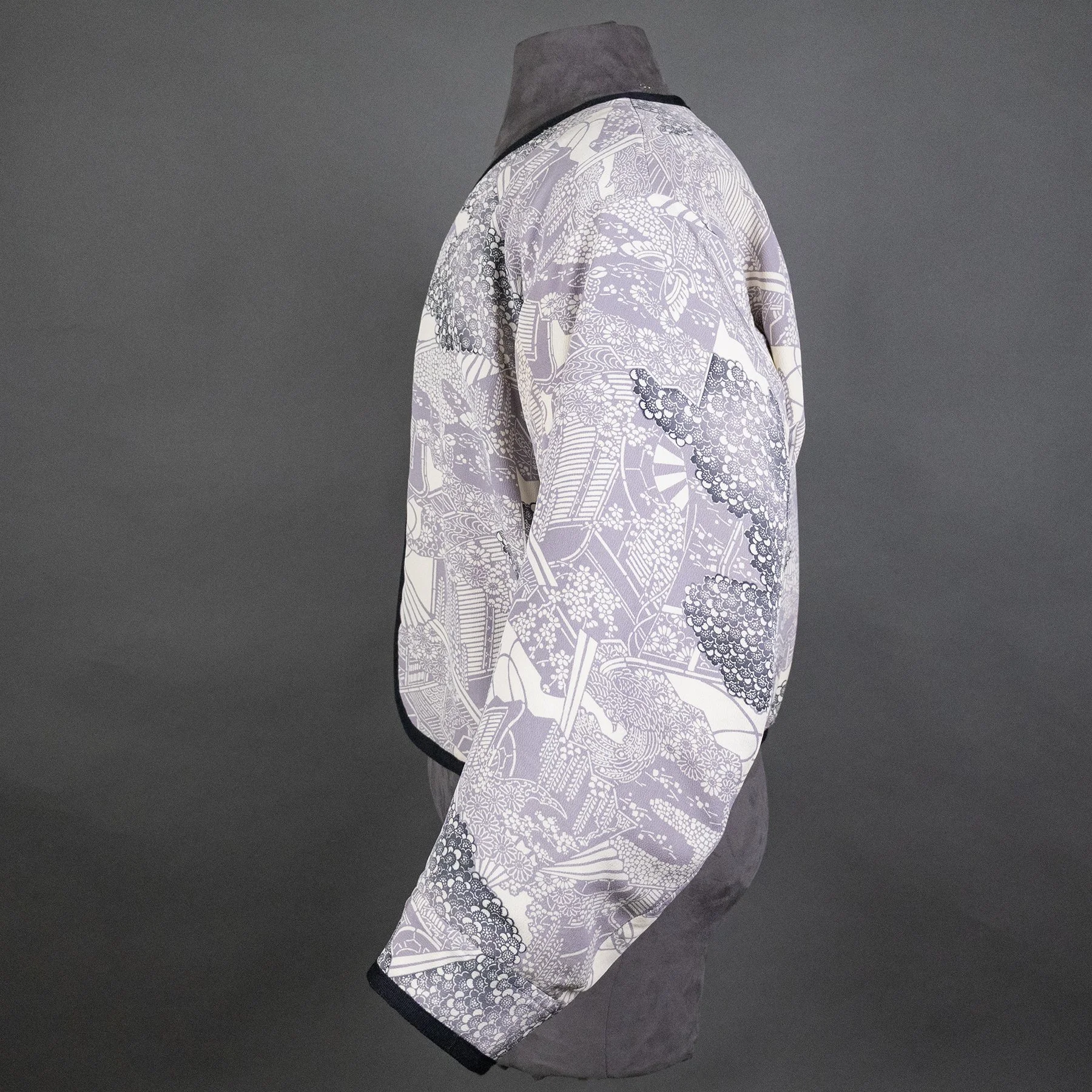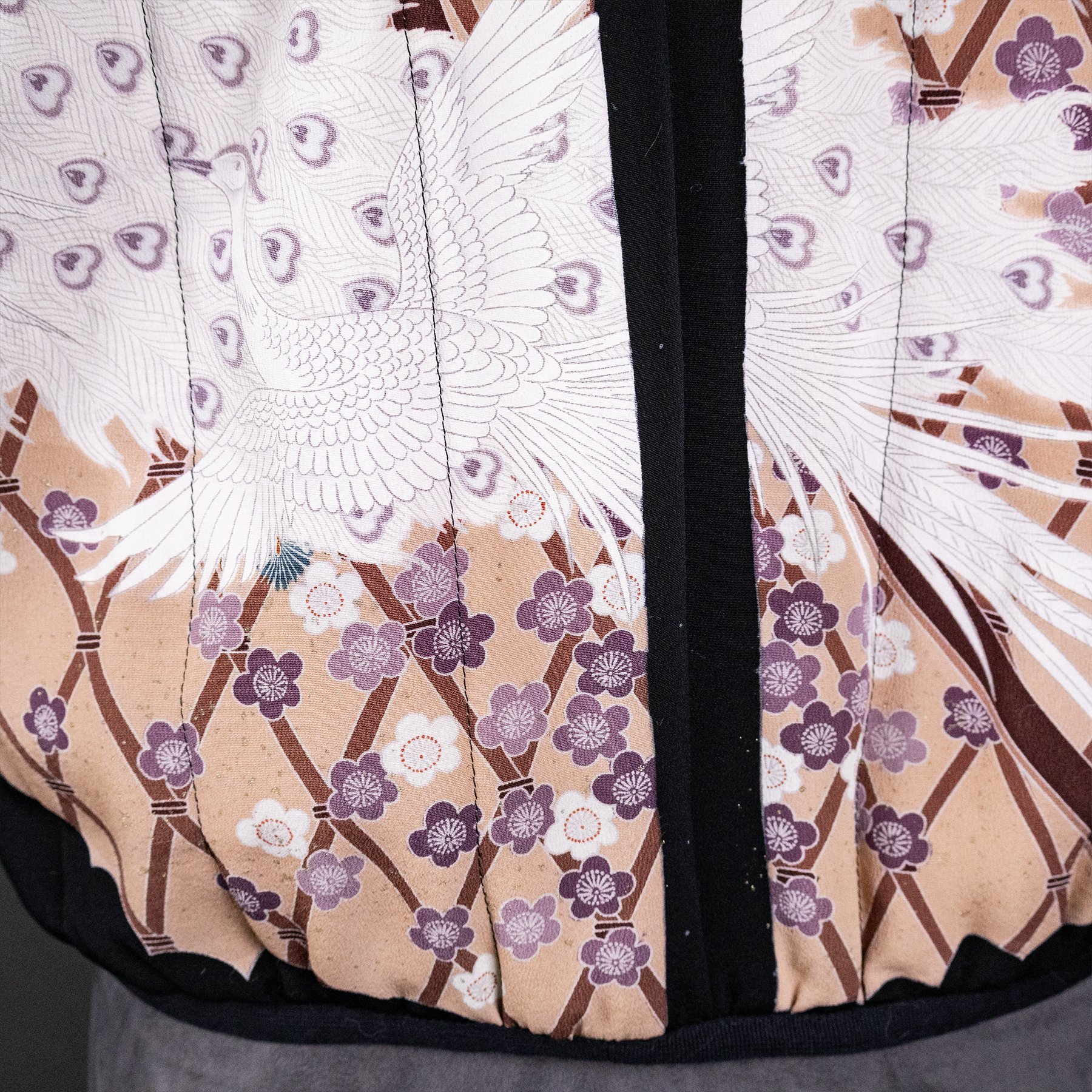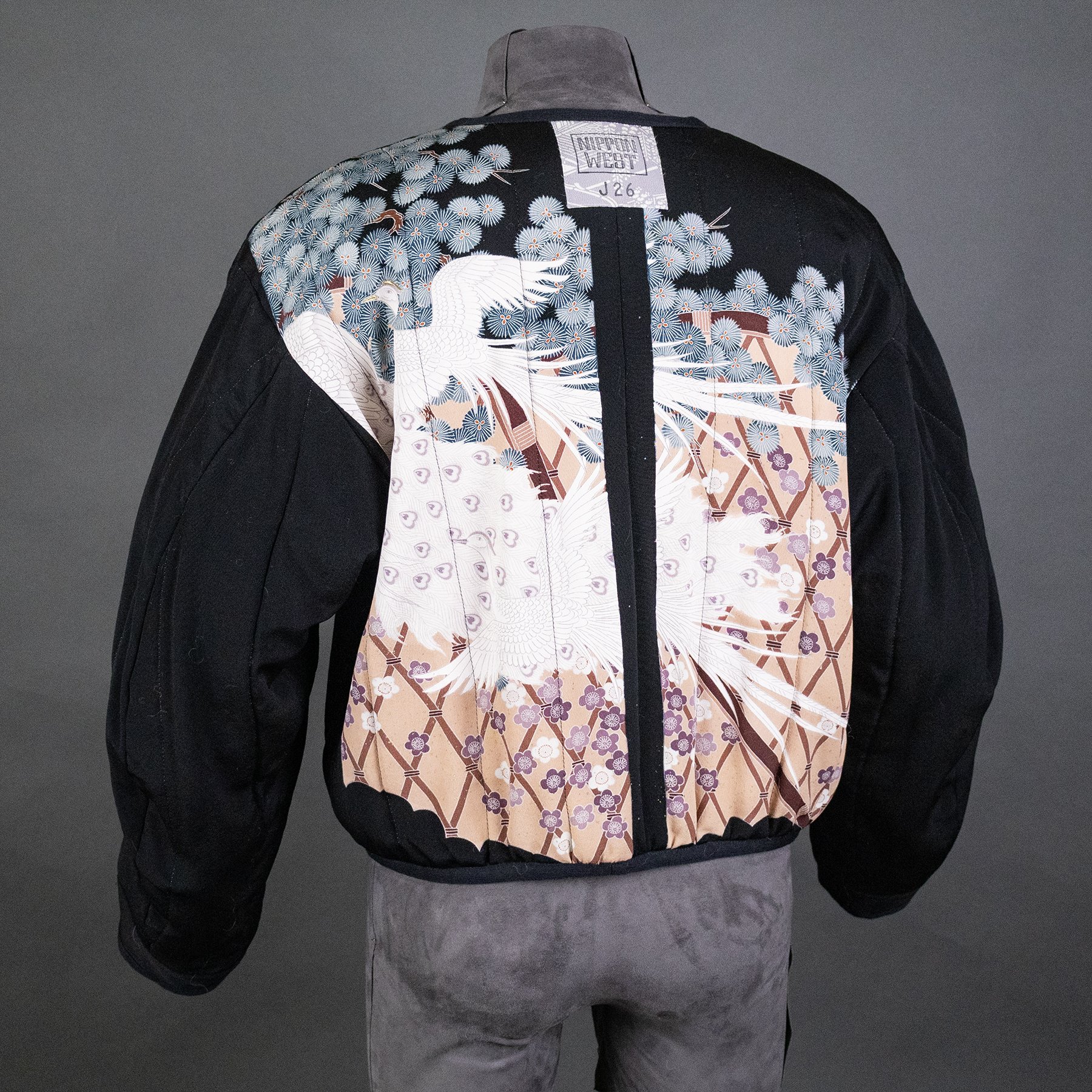 I repurposed the silk crepe for this bomber jacket from two vintage kimonos. The fabric for the outer layer is stenciled with a complex pattern including fans, butterflies, carts, wisteria, chrysanthemums, and hand-dyed cherry blossoms. And I made the quilted, inner lining from a formal visiting kimono depicting white peacocks, latticework, pines, and more cherry blossoms. The lining also features family crests of the patron who commissioned this elaborate kimono.