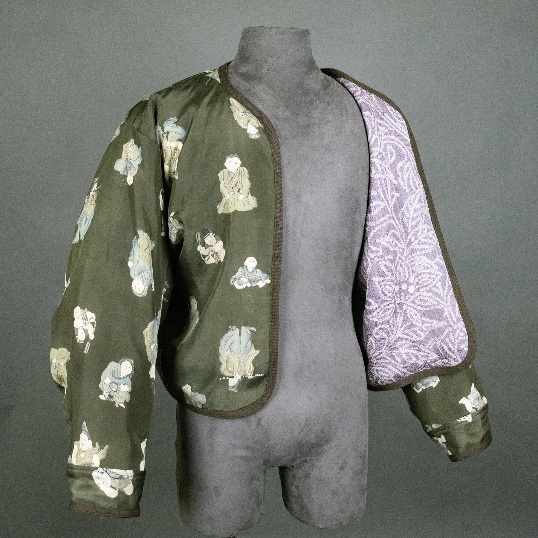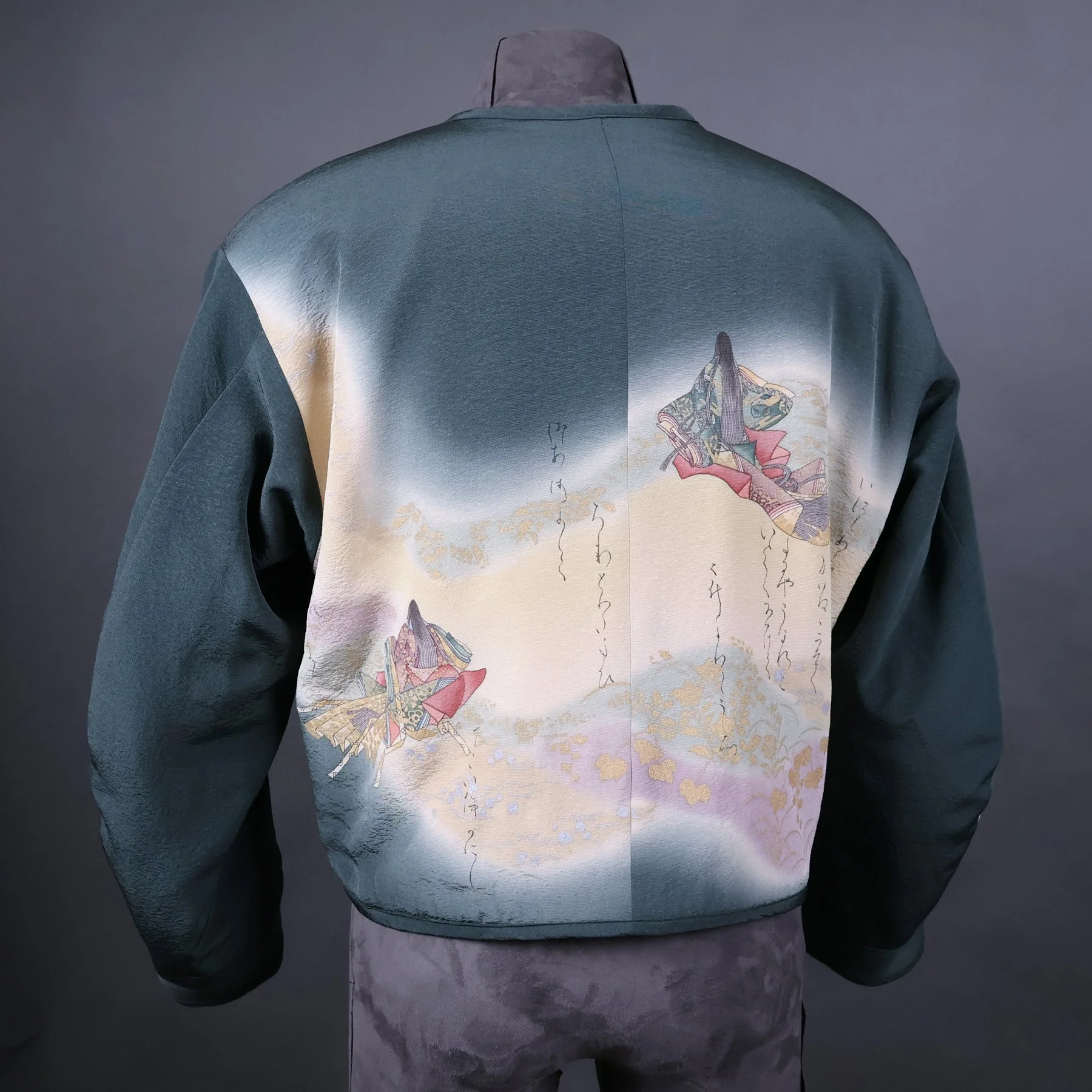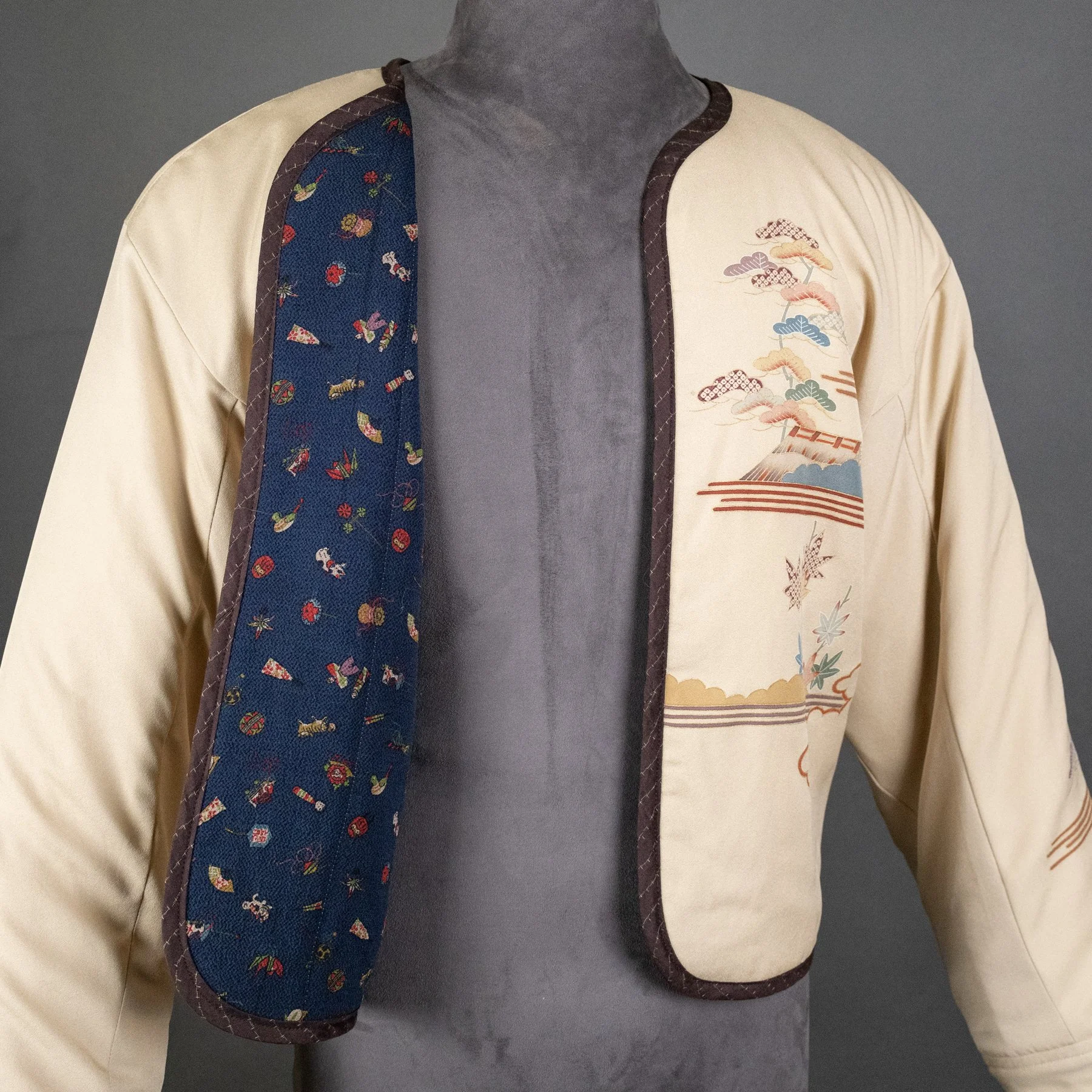 For the exterior of this jacket, I repurposed silk from a rare tomesode kimono featuring vignettes from The Tale of Genji, Japan's most famous book, and one of the world's first novels. The author is depicted wearing voluminous, layered kimonos in the style of a Heian-era noblewoman. The caligraphy script quoting famous passages is stenciled with dye and not written with an ink brush. These pictorial motifs originally adorned the bottom hem of the kimono, but I was able to reposition them around the torso. And I placed the signature of the artist responsible for this masterful piece of Japanese textile art on an interior pocket. The lining is comprised of stenciled komon silks from two different kimonos I deconstructed. One combines a geometric pattern with tiny flowers, and the other combines stripes with children's toys.