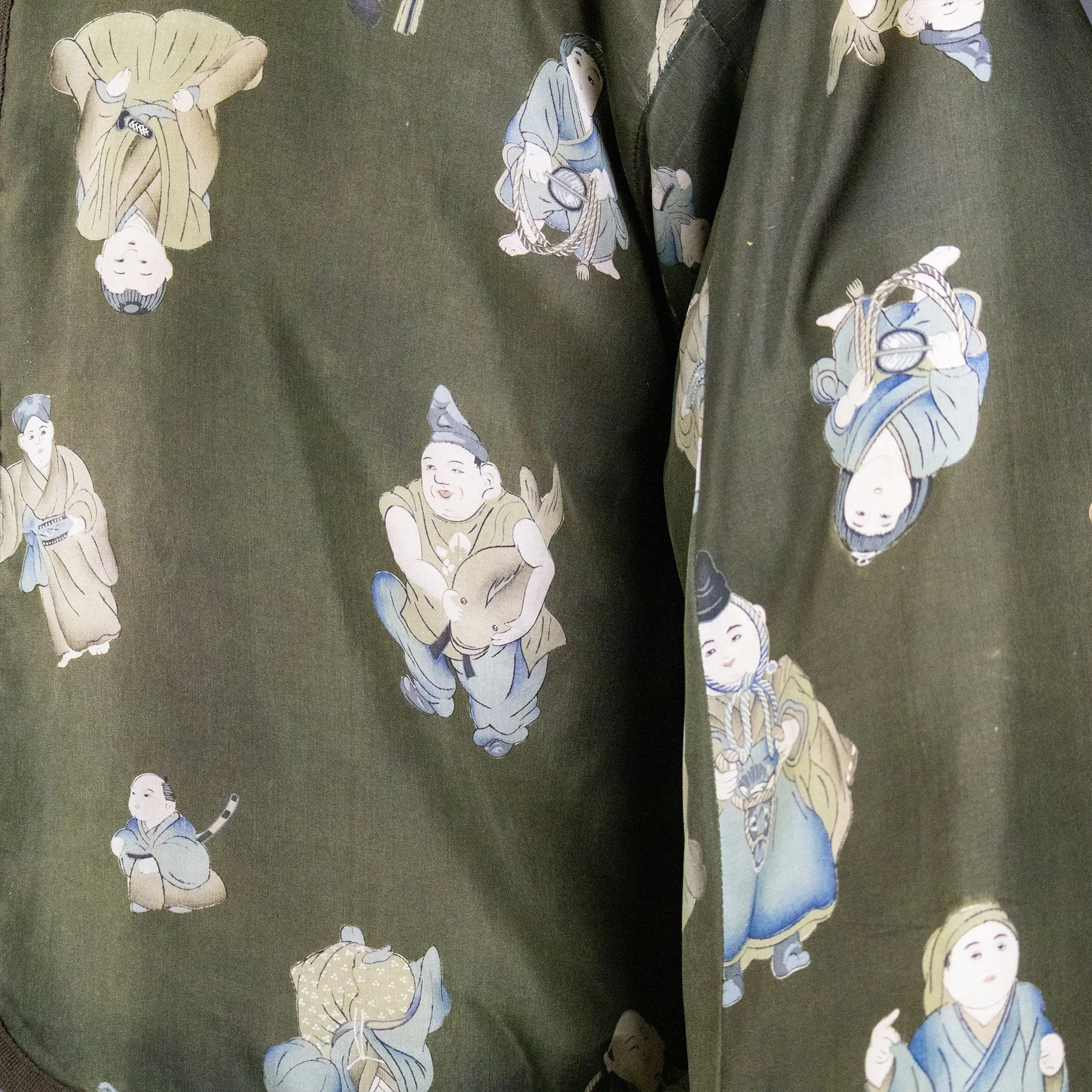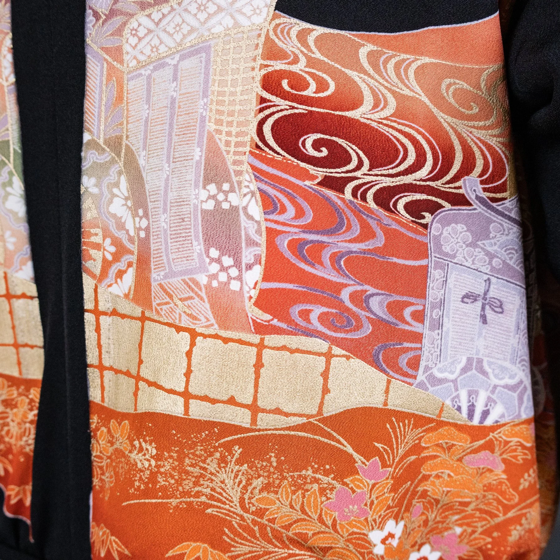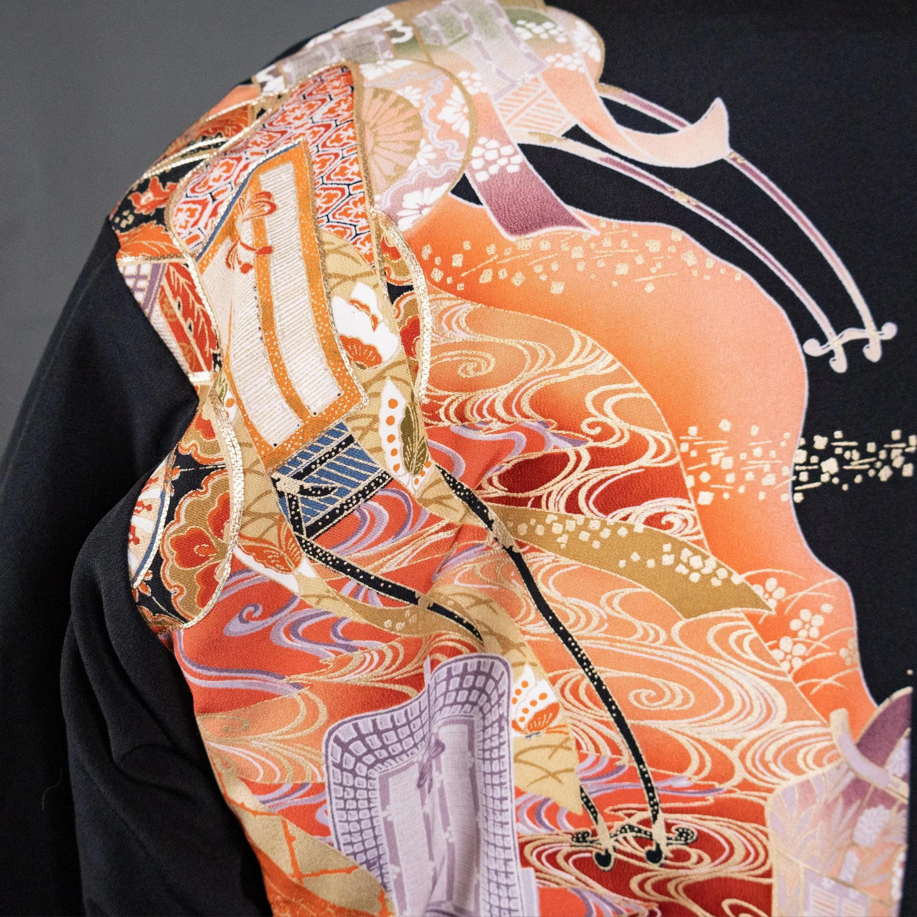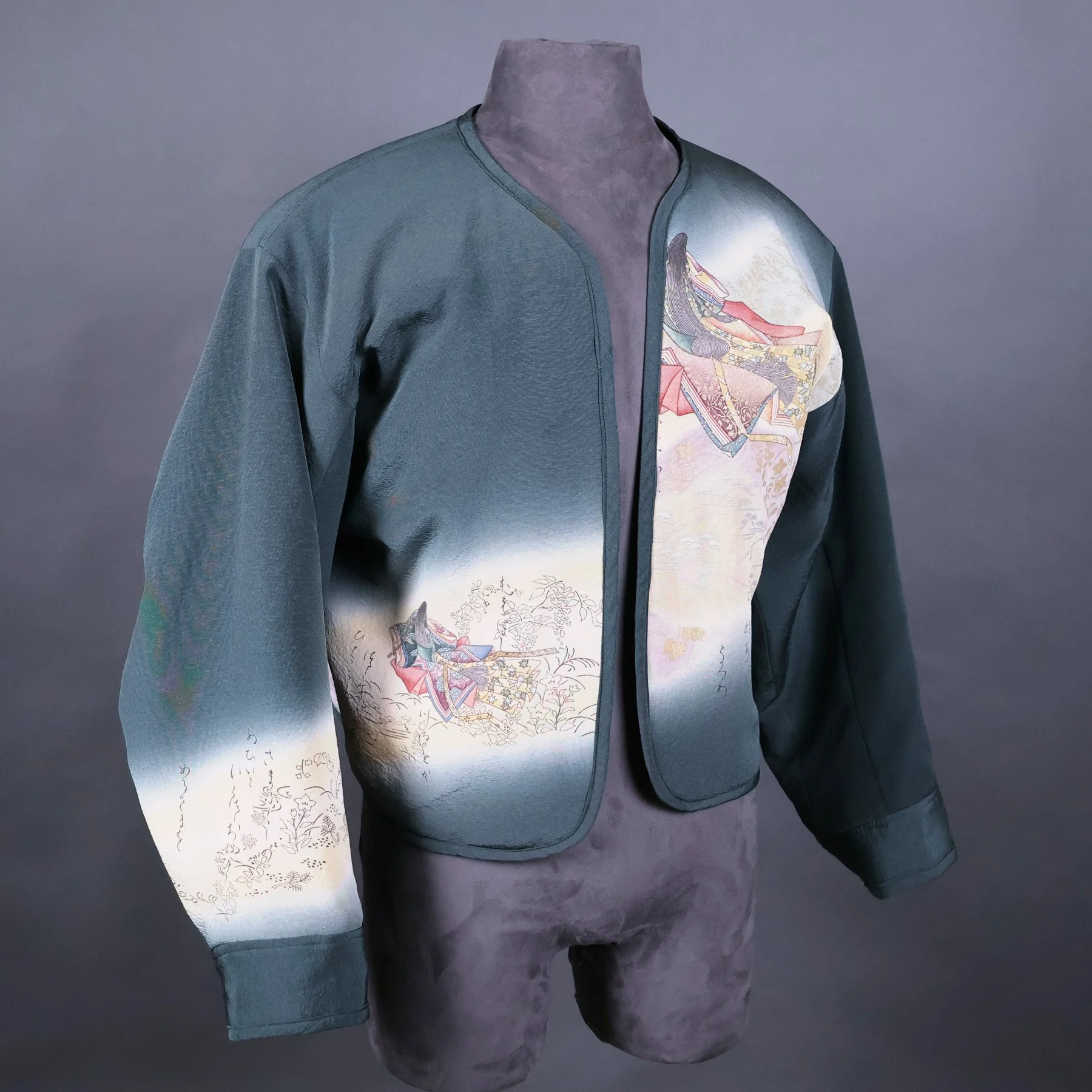 For the exterior of this jacket, I repurposed silk from a rare tomesode kimono featuring vignettes from The Tale of Genji, Japan's most famous book, and one of the world's first novels. The author is depicted wearing voluminous, layered kimonos in the style of a Heian-era noblewoman. The caligraphy script quoting famous passages is stenciled with dye and not written with an ink brush. These pictorial motifs originally adorned the bottom hem of the kimono, but I was able to reposition them around the torso. And I placed the signature of the artist responsible for this masterful piece of Japanese textile art on an interior pocket. The lining is comprised of stenciled komon silks from two different kimonos I deconstructed. One combines a geometric pattern with tiny flowers, and the other combines stripes with children's toys.