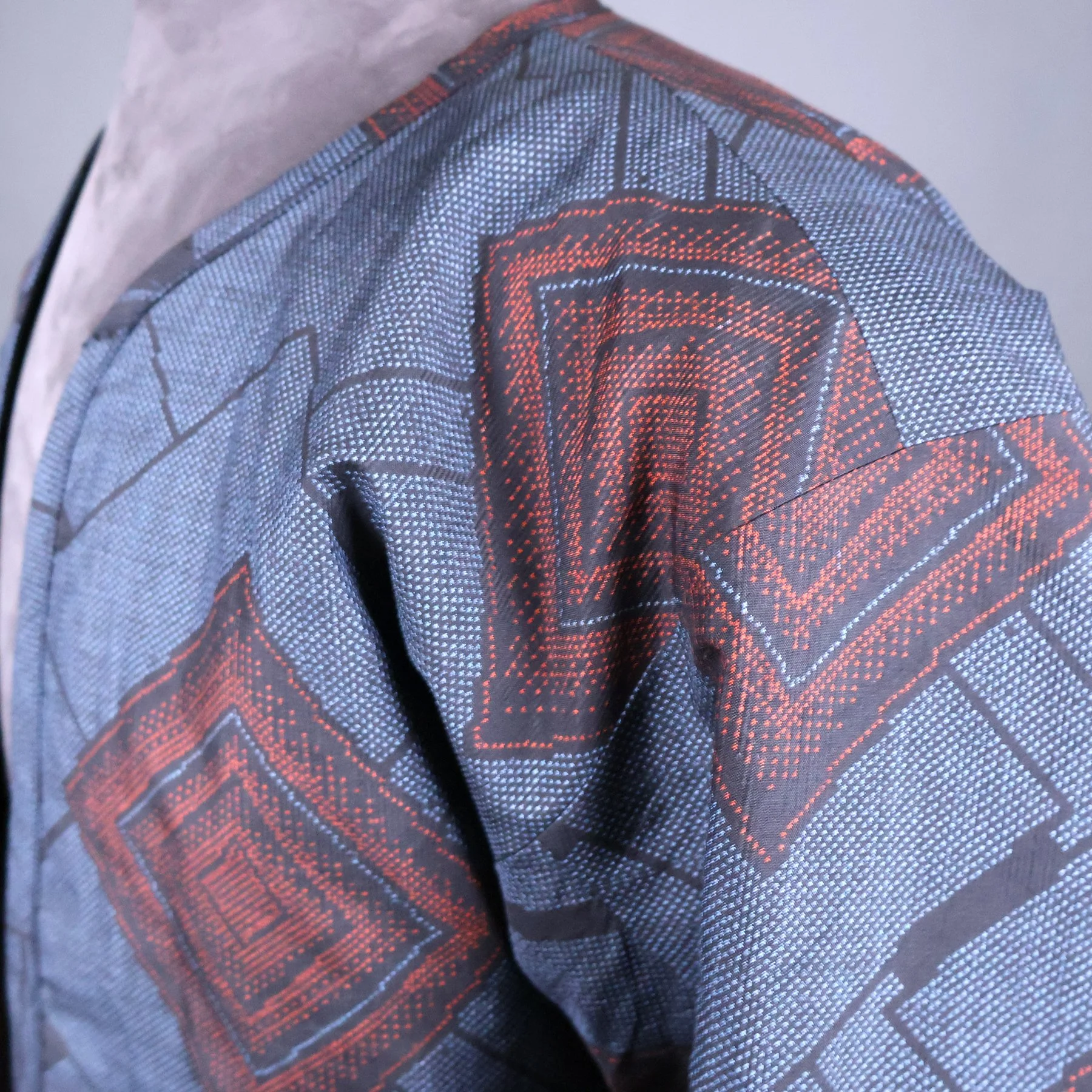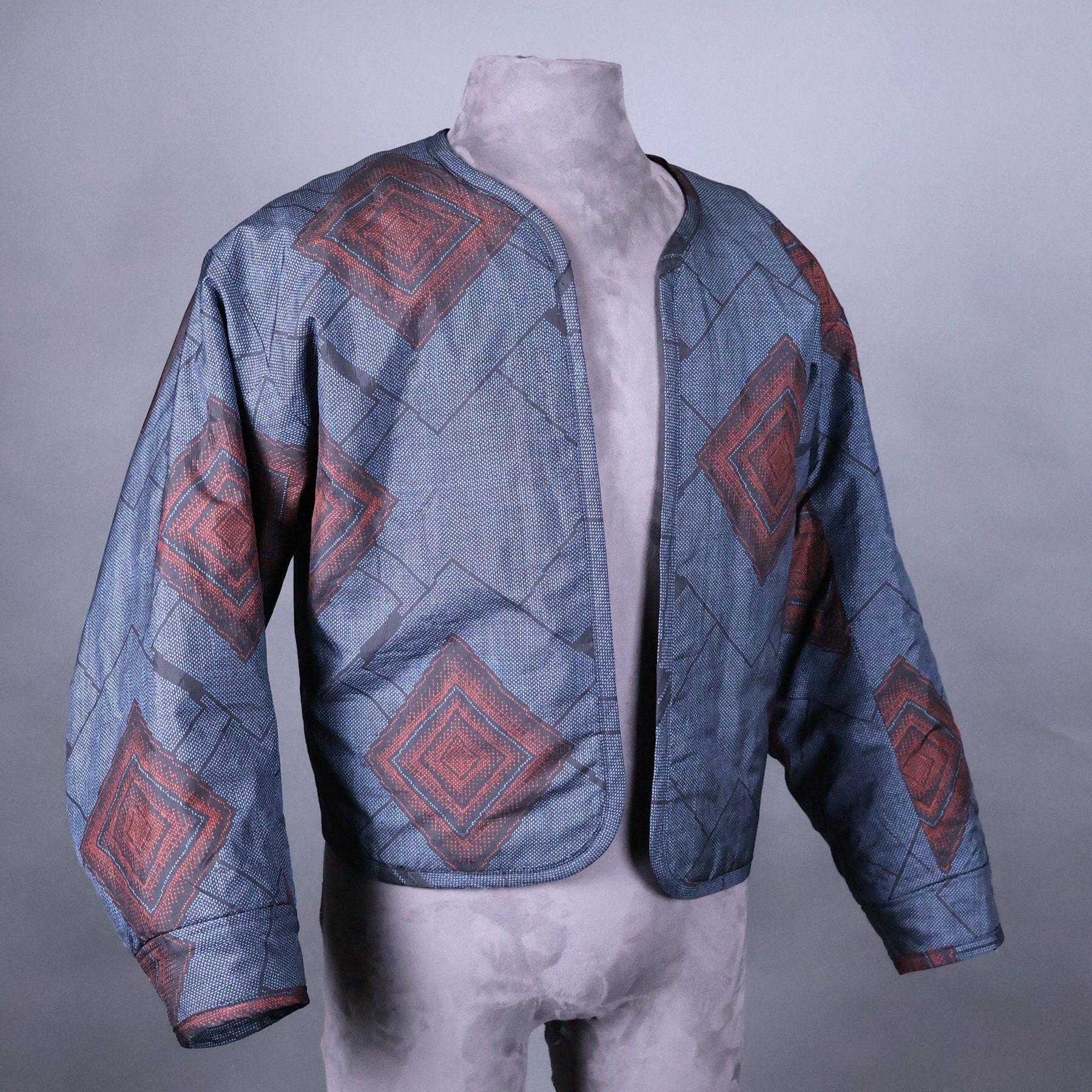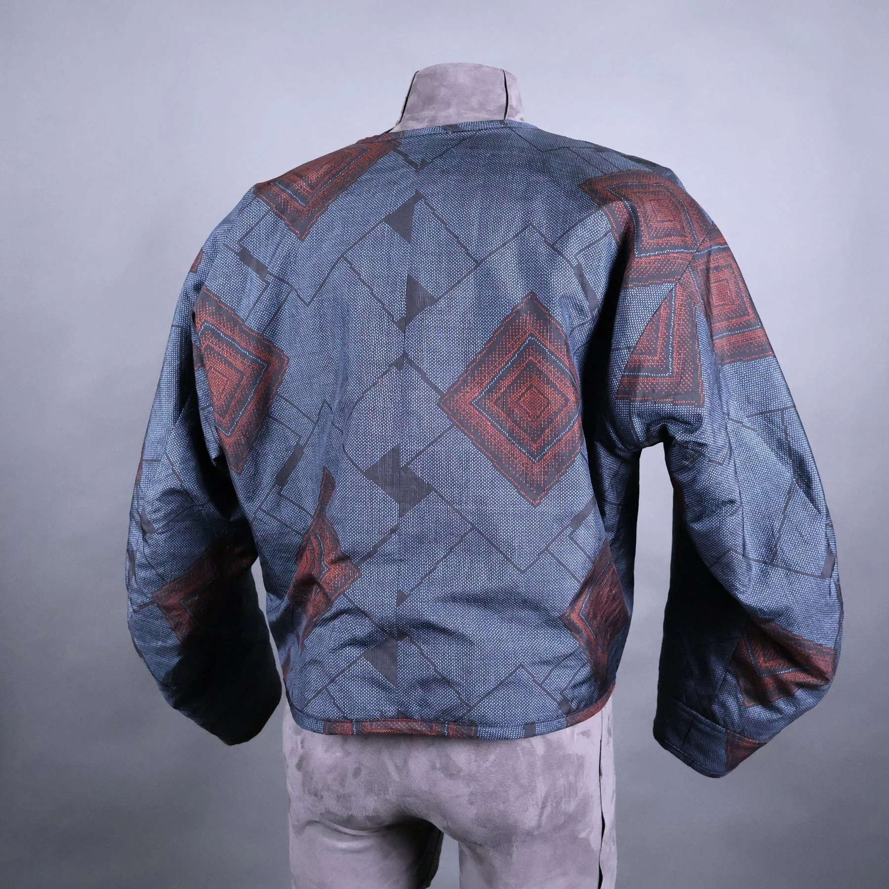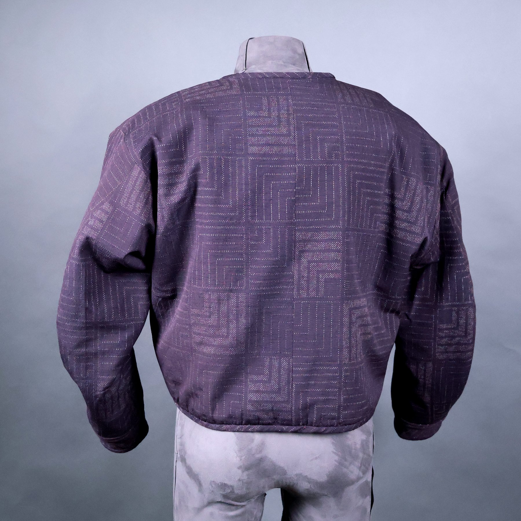 The fabric for the shell of this jacket comes from a vintage tsumugi kimono that I was able to acquire in 2024. The huge palette of thread colors and the delicate shading achieved during the weaving process make it quite exceptional. Not surprisingly, it came with bolt ends indicating the workshop that created it. The sweeping diagonals, extensive use of negative space, and clever asymmetry embody some of my favorite qualities of Japanese art. And I spent a lot of time planning how best to map the diverse motifs from a columnar kimono silhouette onto a shaped jacket with large, engineered sleeves. The lining is a silk crepe stenciled with a traditional sharkskin pattern that comes from a vintage kimono I deconstructed.