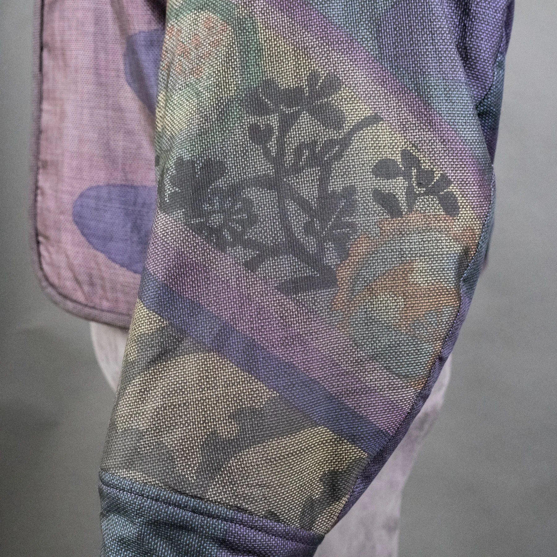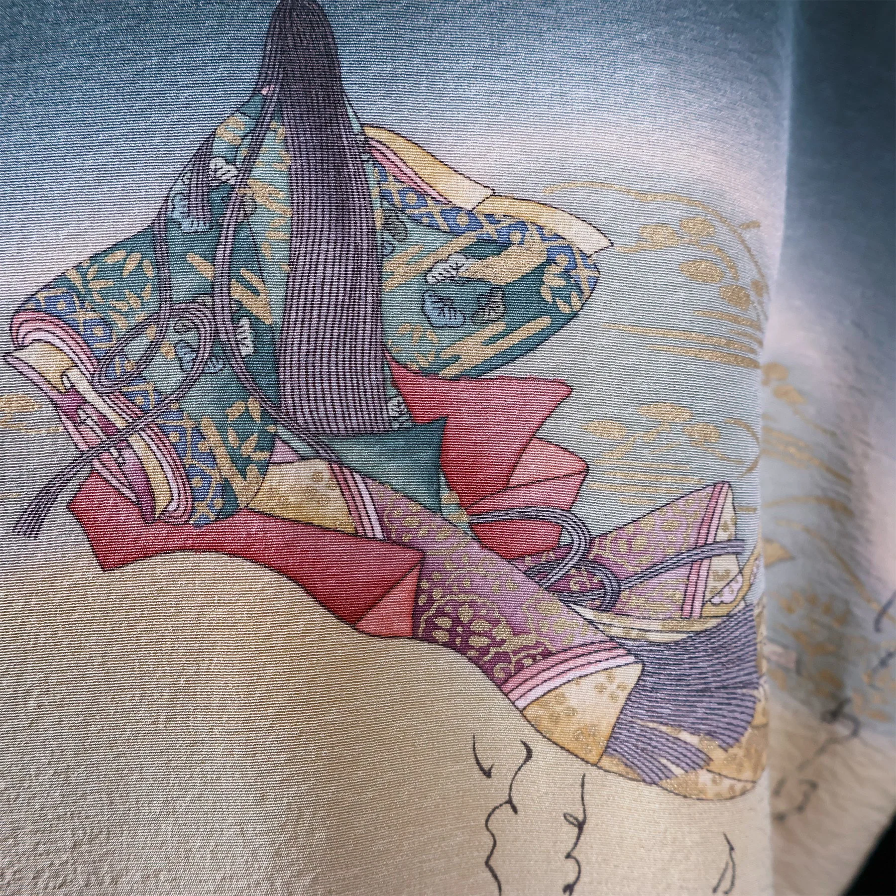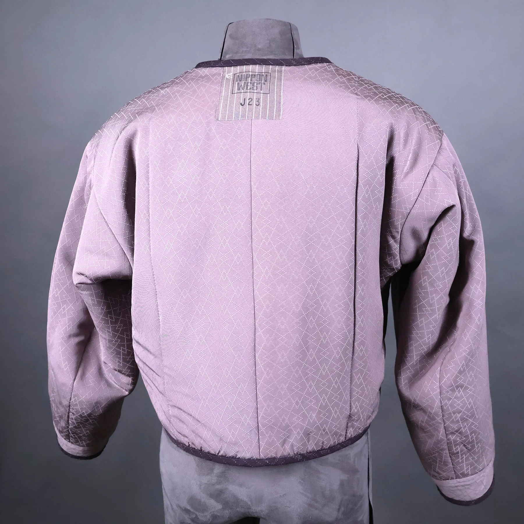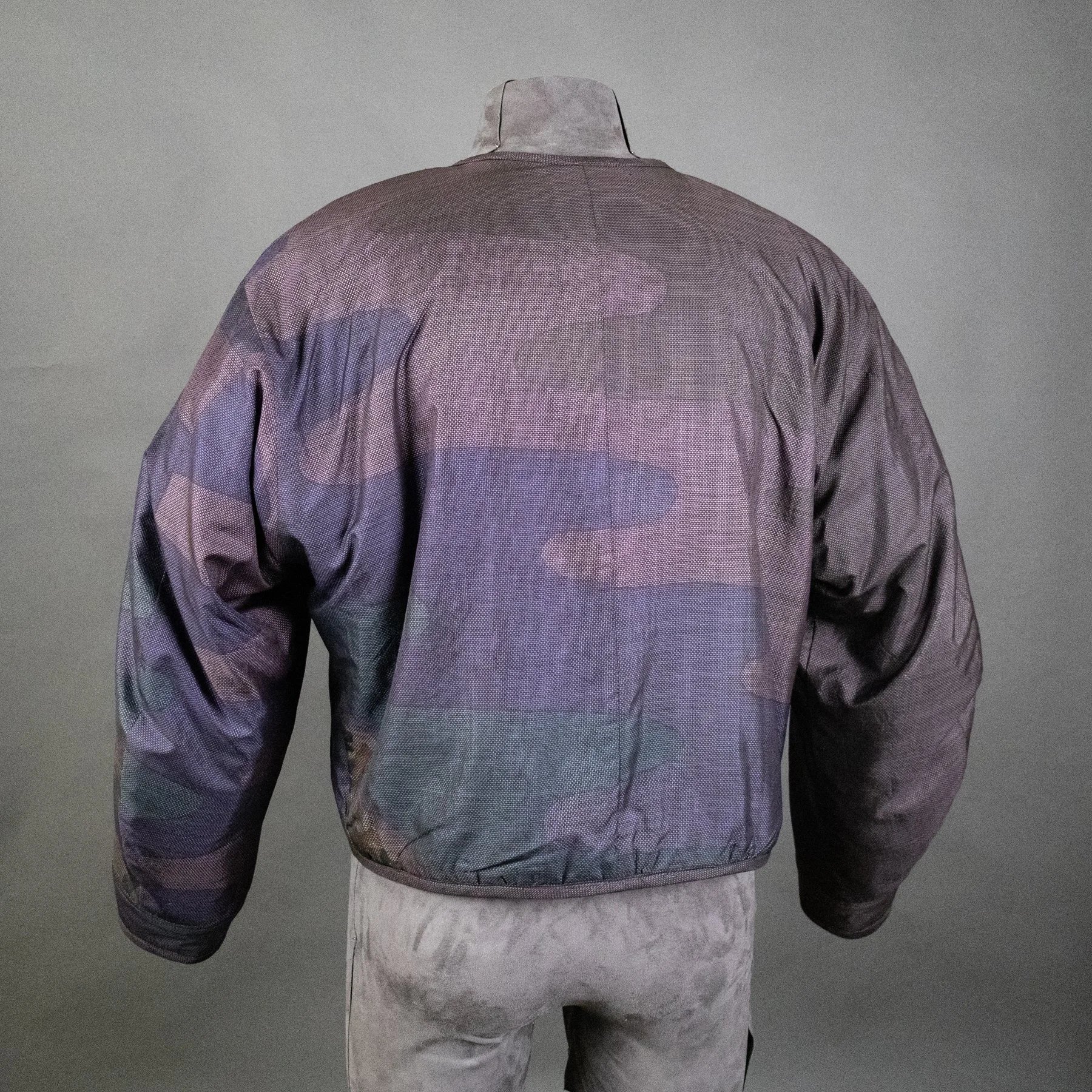 The fabric for the shell of this jacket comes from a vintage tsumugi kimono that I was able to acquire in 2024. The huge palette of thread colors and the delicate shading achieved during the weaving process make it quite exceptional. Not surprisingly, it came with bolt ends indicating the workshop that created it. The sweeping diagonals, extensive use of negative space, and clever asymmetry embody some of my favorite qualities of Japanese art. And I spent a lot of time planning how best to map the diverse motifs from a columnar kimono silhouette onto a shaped jacket with large, engineered sleeves. The lining is a silk crepe stenciled with a traditional sharkskin pattern that comes from a vintage kimono I deconstructed.