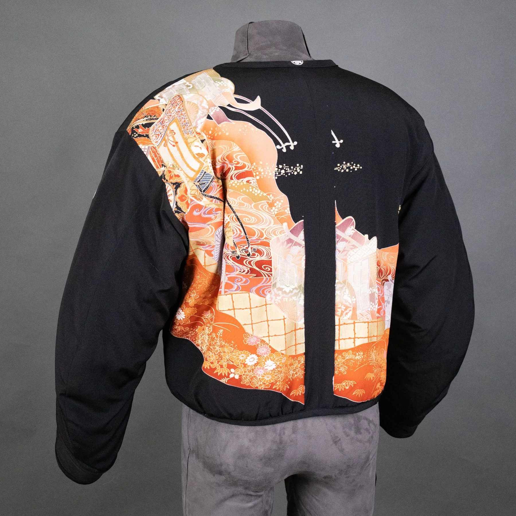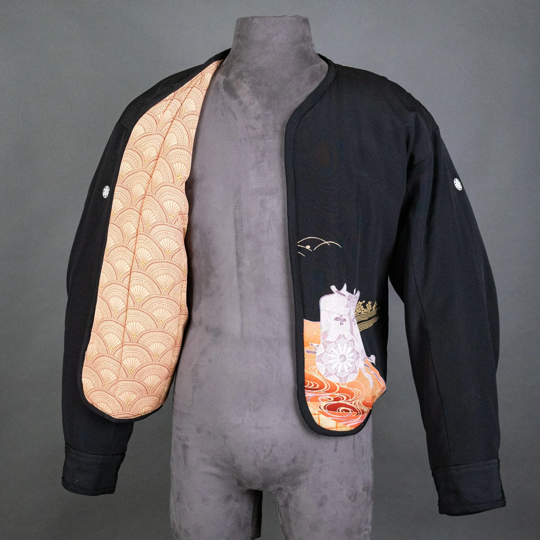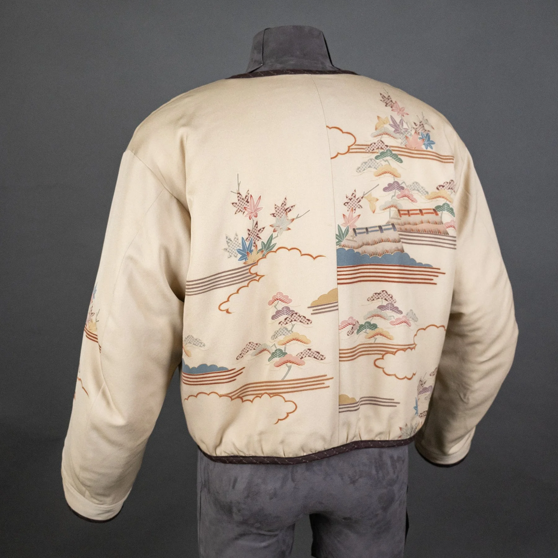 The lavish scenes of an imperial cart in an autumn landscape now appear on the torso of this bomber jacket, and I was able to repurpose three of the family crests: two on the sleeves and one on the back collar. The back of the jacket shows almost the entirety of the fabric width and how the design motifs overlapped when painted and dyed to allow for a perfect join when seaming.