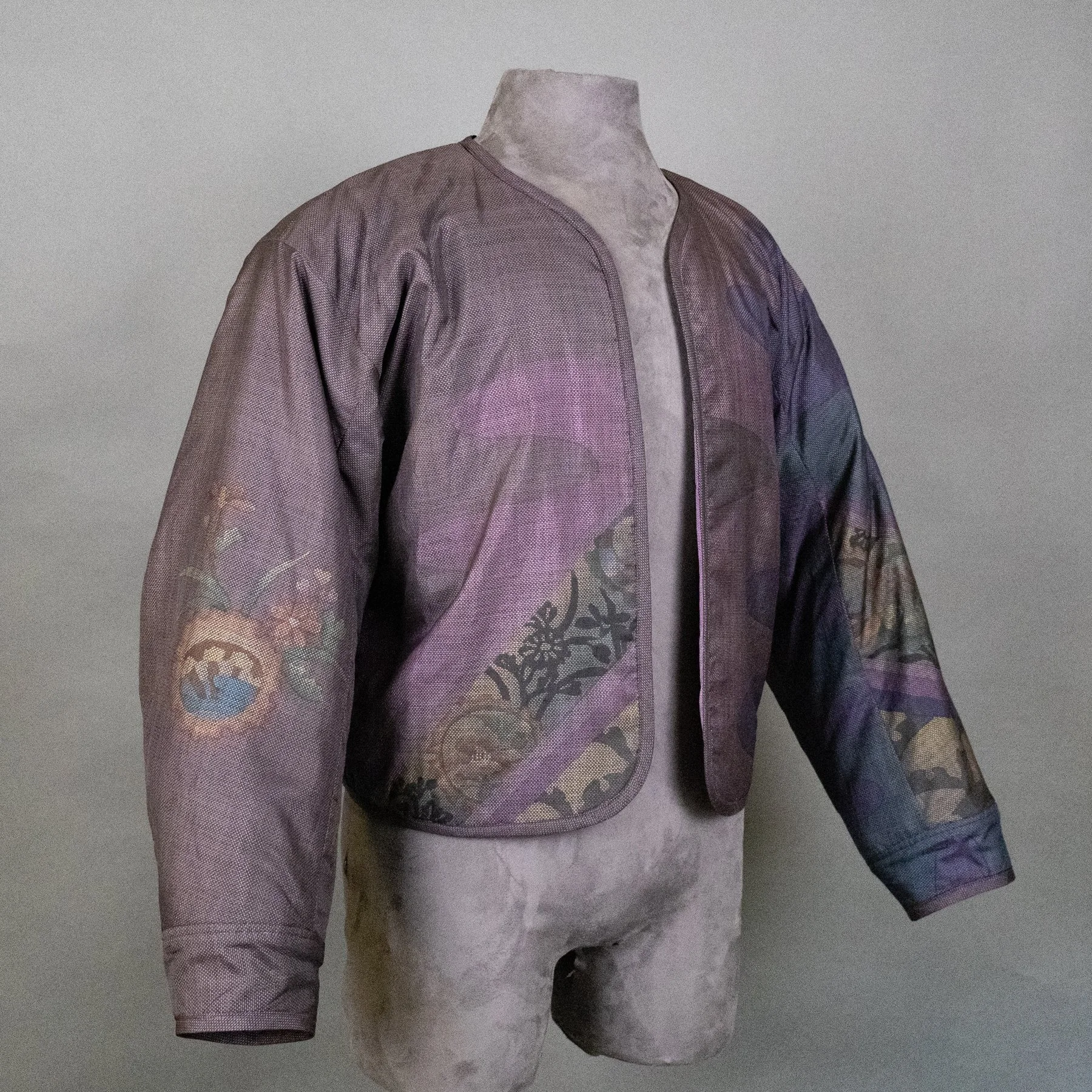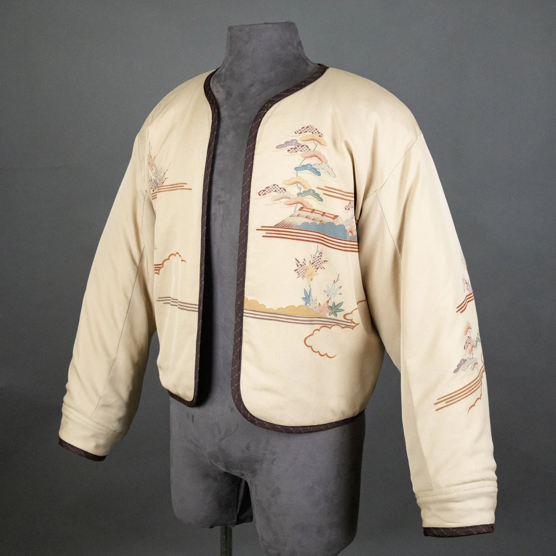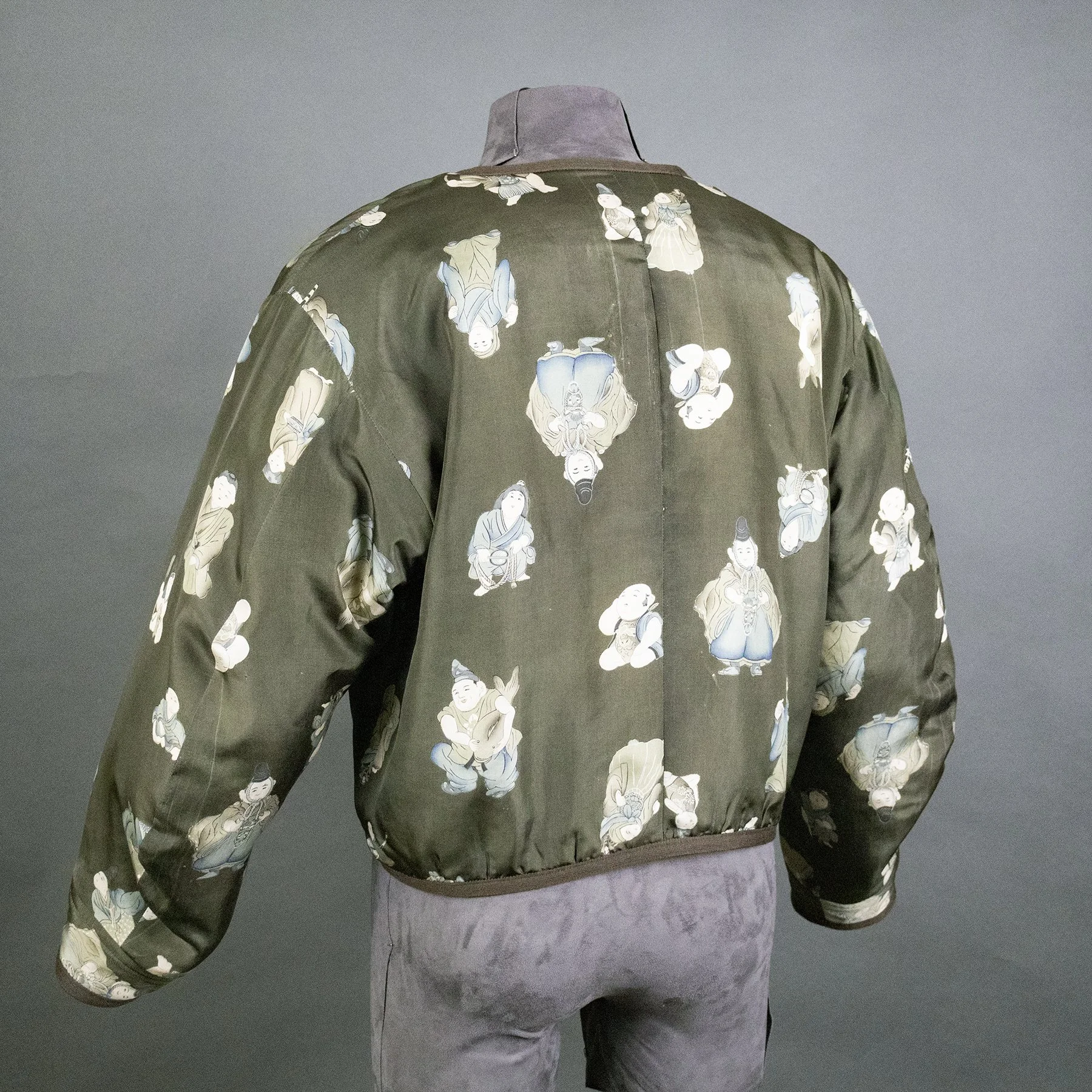 The lavish scenes of an imperial cart in an autumn landscape now appear on the torso of this bomber jacket, and I was able to repurpose three of the family crests: two on the sleeves and one on the back collar. The back of the jacket shows almost the entirety of the fabric width and how the design motifs overlapped when painted and dyed to allow for a perfect join when seaming.