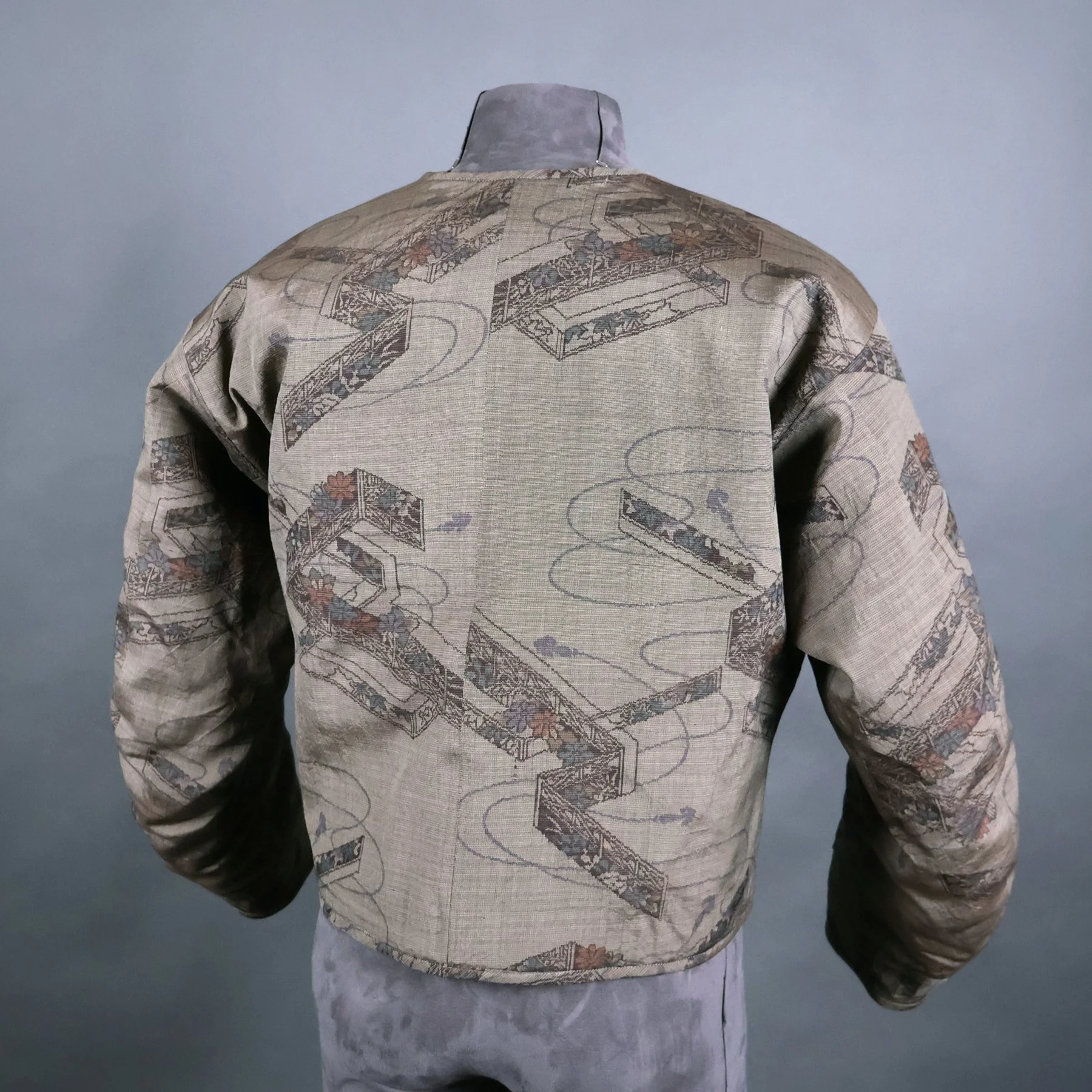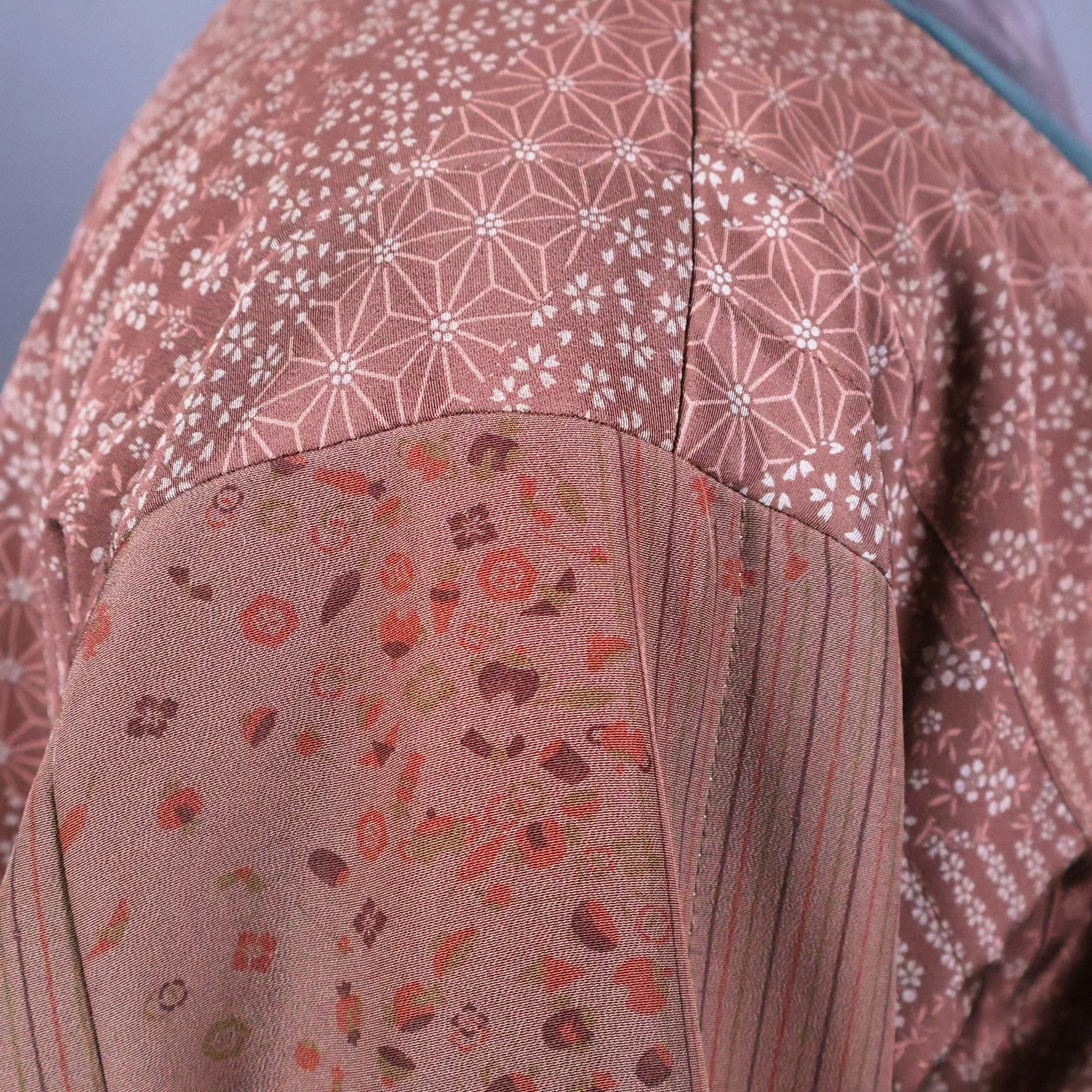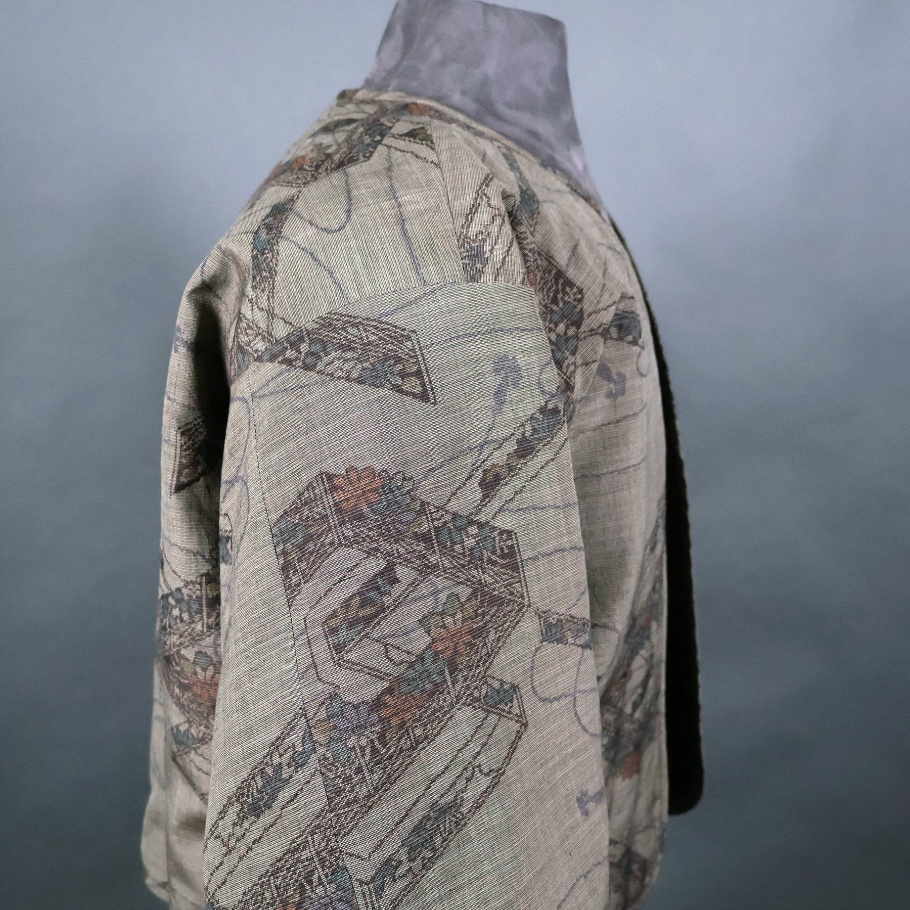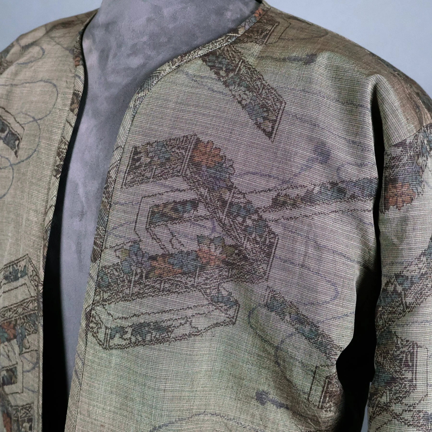 The vintage silk used for the shell of this jacket has a lyrical quality that is difficult to achieve in a woven fabrics. Most Japanese tsumugi kimonos have strong horizontal and vertical motifs, because they’re easier to weave. This pattern depicting garden fencing and flowers, however, becomes a medley of overlapping diagonals rendered in traditional Japanese isometric perspective. The combination of smokey grays and browns with soft pastels represents a particularly Japanese color palette. The silk fibers are rough spun with tiny slubs, and the fabric has a has a nice stiffness that made it a pleasure to work with. I made the lining using a lightweight silk fabric from a man’s vintage nagajuban (under kimono) that I deconstructed.