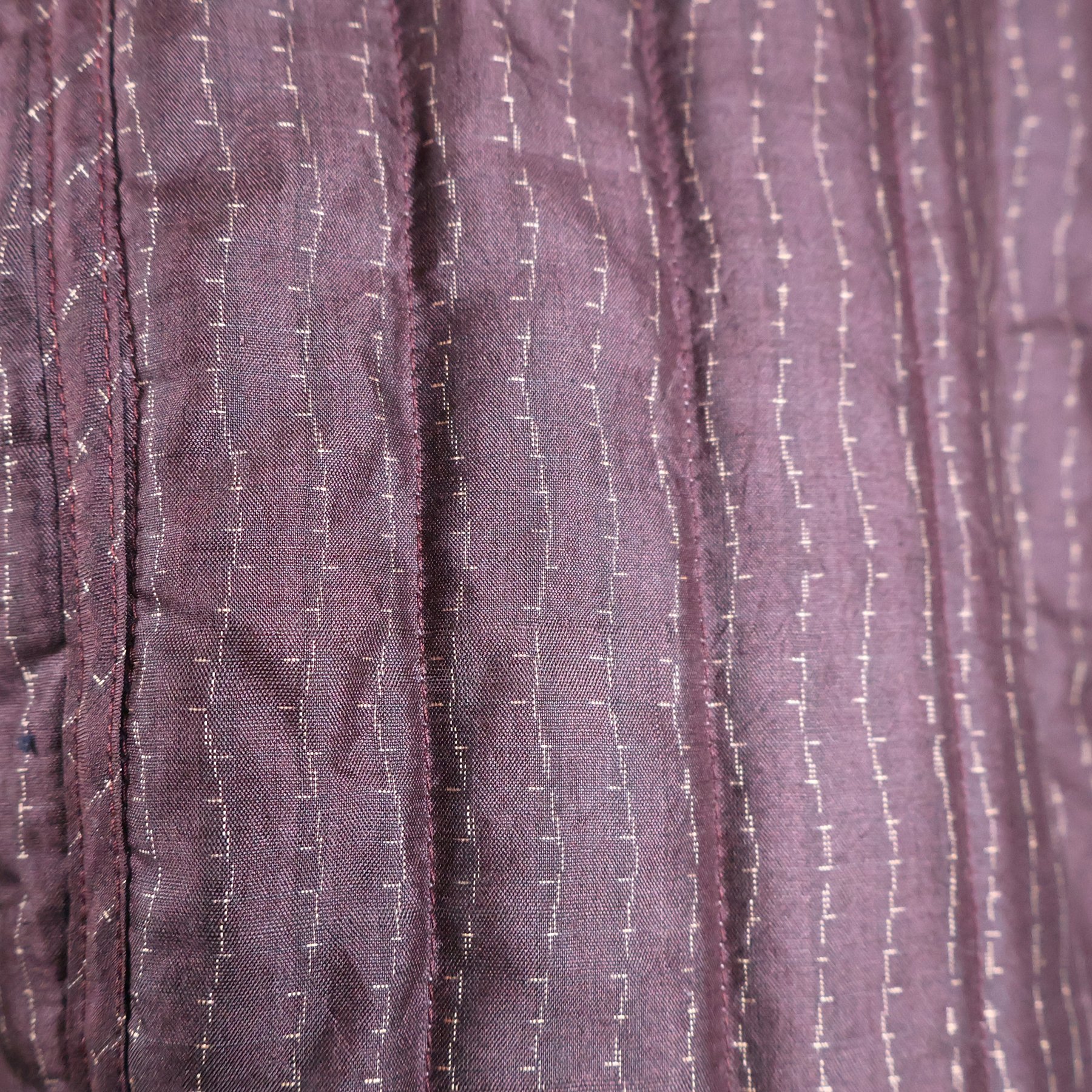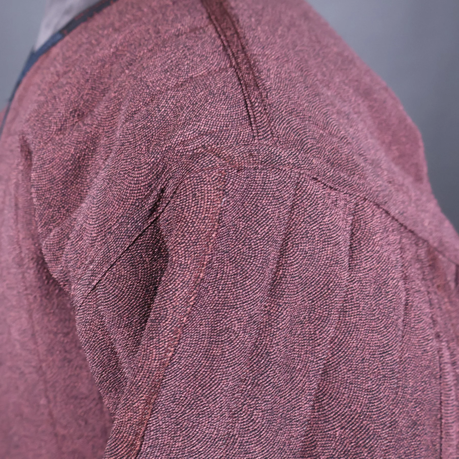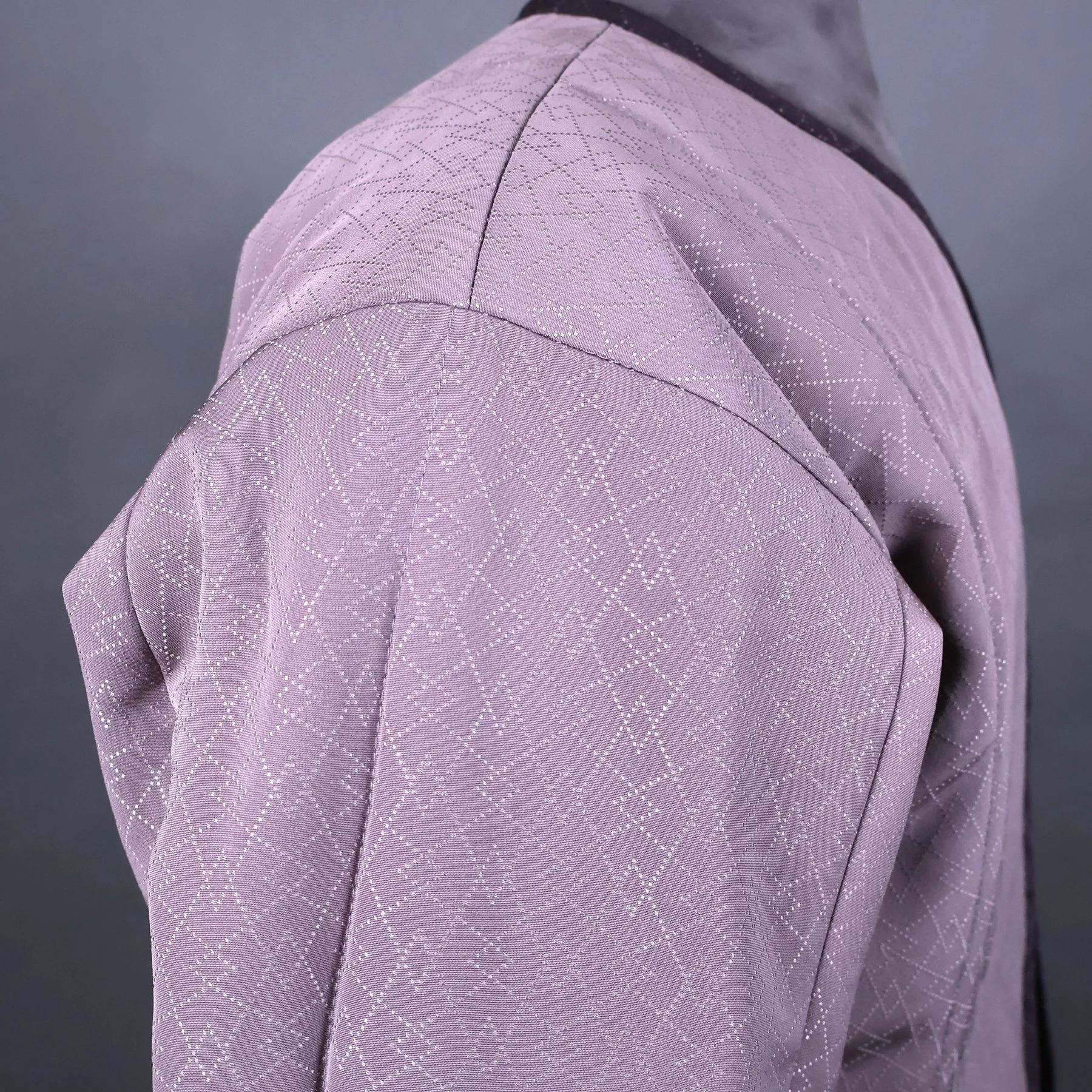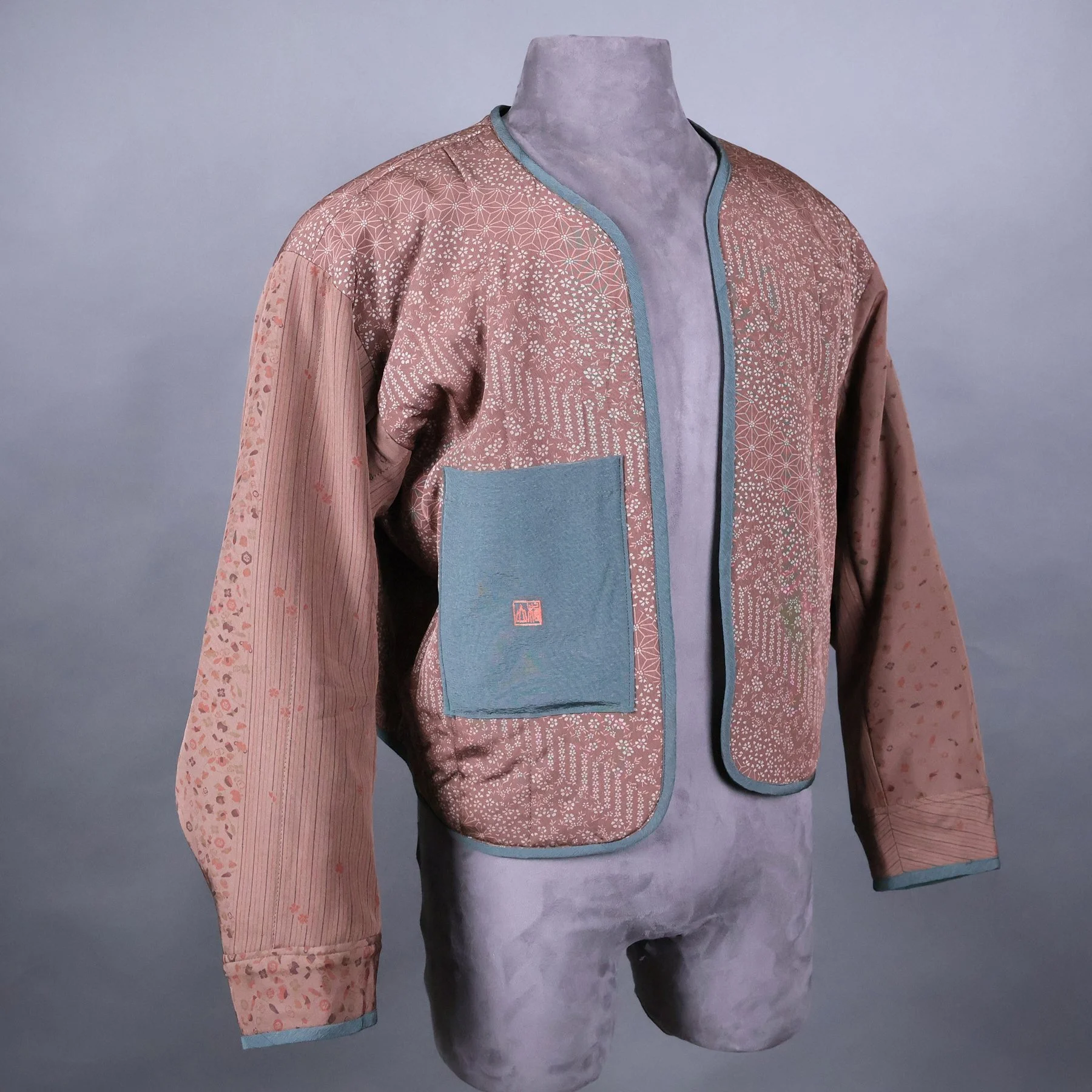 The vintage silk used for the shell of this jacket has a lyrical quality that is difficult to achieve in a woven fabrics. Most Japanese tsumugi kimonos have strong horizontal and vertical motifs, because they’re easier to weave. This pattern depicting garden fencing and flowers, however, becomes a medley of overlapping diagonals rendered in traditional Japanese isometric perspective. The combination of smokey grays and browns with soft pastels represents a particularly Japanese color palette. The silk fibers are rough spun with tiny slubs, and the fabric has a has a nice stiffness that made it a pleasure to work with. I made the lining using a lightweight silk fabric from a man’s vintage nagajuban (under kimono) that I deconstructed.
