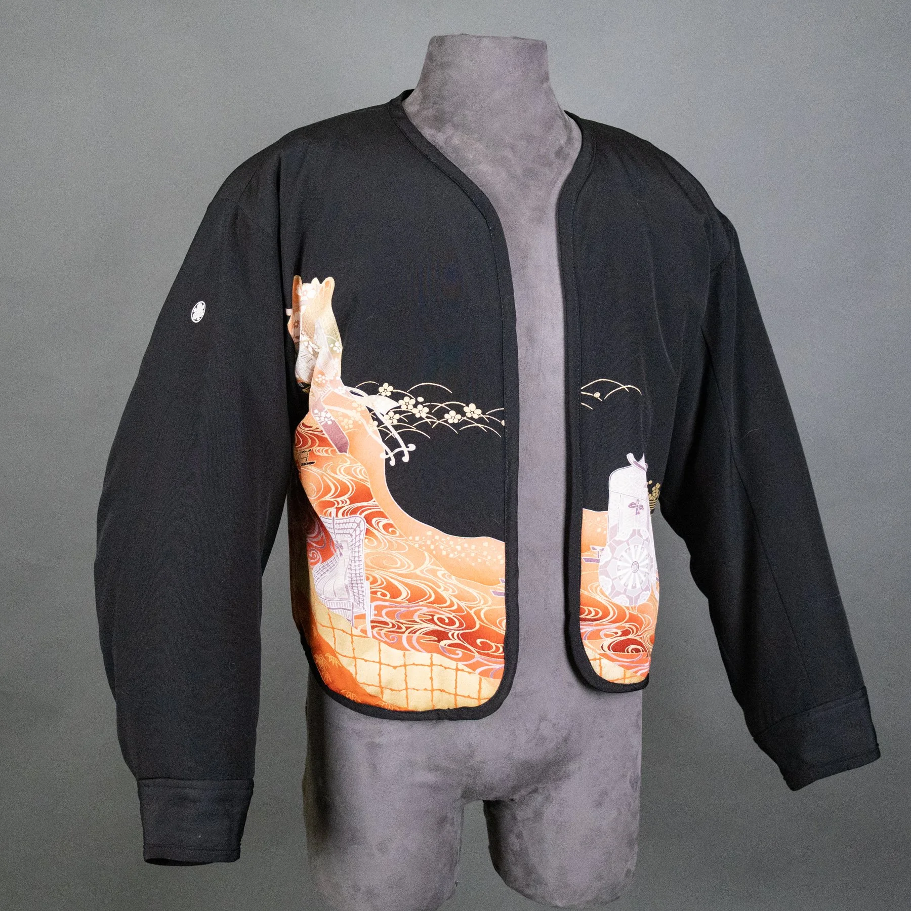 I made this jacket from a vintage tomesode kimono that I disassembled. A very formal, special occasion kimono, tomesode feature five family crests and a non-repeating design that cascades from the hips to the ground. This one also incorporates gold thread embroidery.