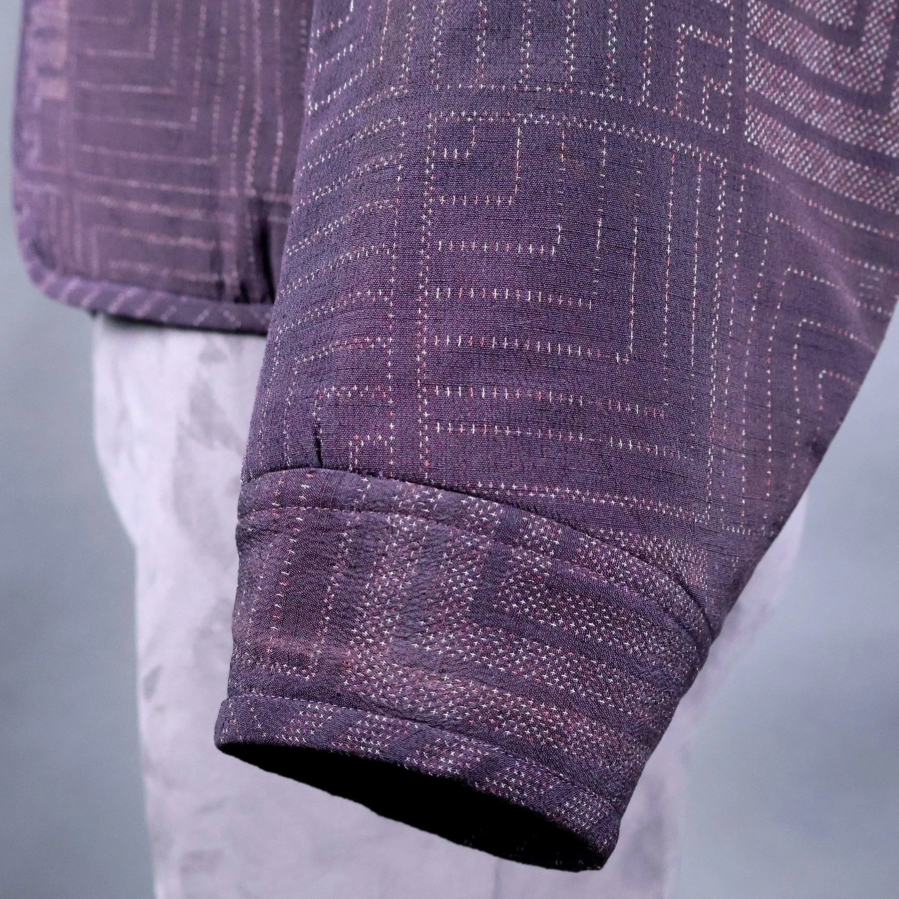 I like this heavyweight woven silk for the diagonal elements that emerge from a strictly horizontal and vertical design. Producing this very rational pattern in a moody violet and aubergine palette, however, feels very Japanese to me. The variegated colors in the warp yarns and the slubs in the weft give the design a natural, organic feel that softens the geometry of the weave pattern.